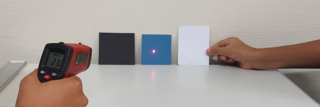 Durchführung: Stelle die Pappen nebeneinander in einigem Abstand zur Lampe auf, ohne die Lampe einzuschalten. Miss die Ausgangstemperatur der unterschiedlichen Pappen. Schalte nun die Lampe an und lass sie einige Minuten leuchten. Miss nun die Temperatur der Pappen erneut.