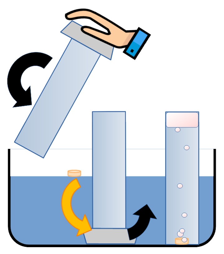 Durchführung: Fülle das Wasserbecken etwa zur Hälfte mit Wasser. Befülle nun eine Flasche randvoll mit kaltem und eine mit warmen Wasser. Decke die Flaschen jeweils mit einem Stück Folie ab und drehe sie um. Stelle sie mit der Öffnung nach unten ins Wasserbecken und entferne die Folie.