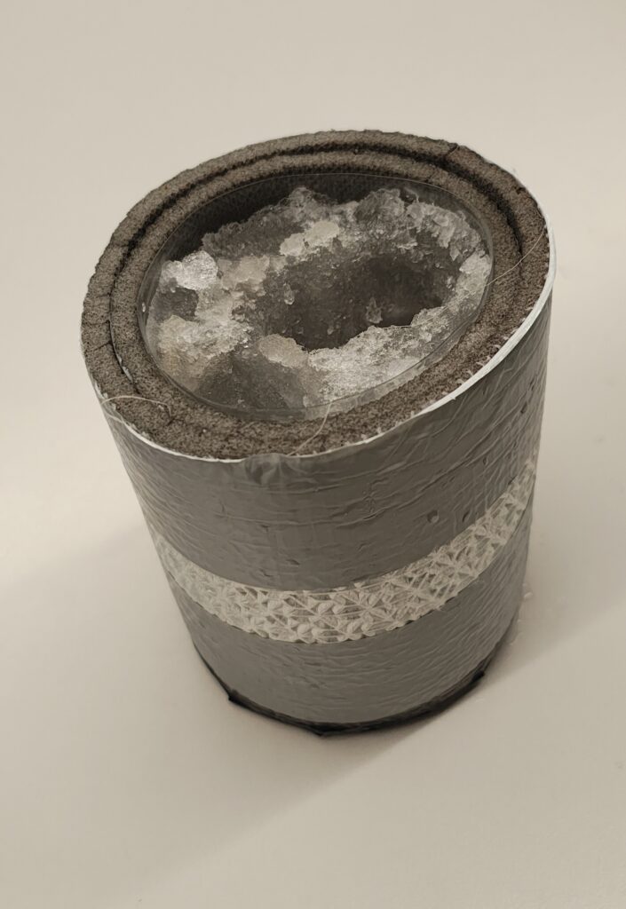 Durch die Isolierung friert das Salzwasser im Gefäß von oben nach unten, genau wie echte Eisschollen.