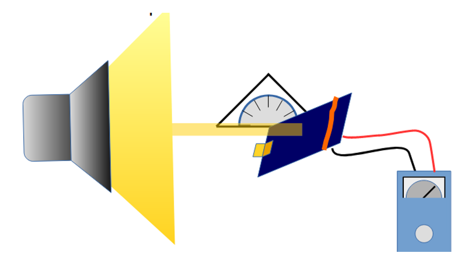 Durchführung: Beleuchte mit der Lampe die Solarzelle und miss dabei die Stromstärke an der Solarzelle. Nimm eine Messreihe auf, bei der du den Winkel der Solarzelle varrierst und die dabei erzeugte Stromstärke misst.